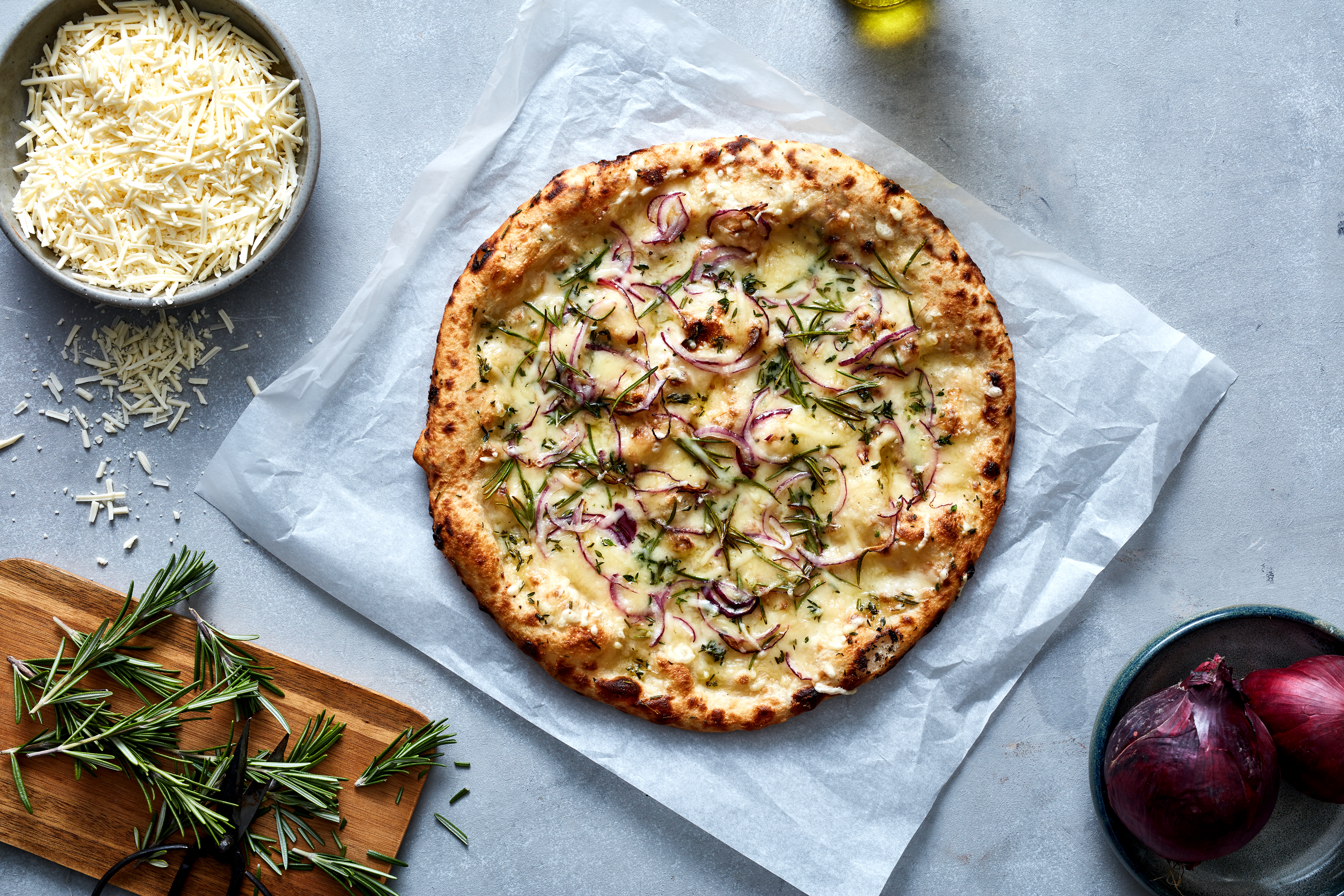 Une pizza blanche crémeuse à base de crème aigre végétale Violife et de mozzarella végétale, garnie de courgette, d’oignon rouge, d’olives vertes et de romarin frais. Une recette 100 % végétale, savoureuse et actuelle, idéale pour la restauration moderne/