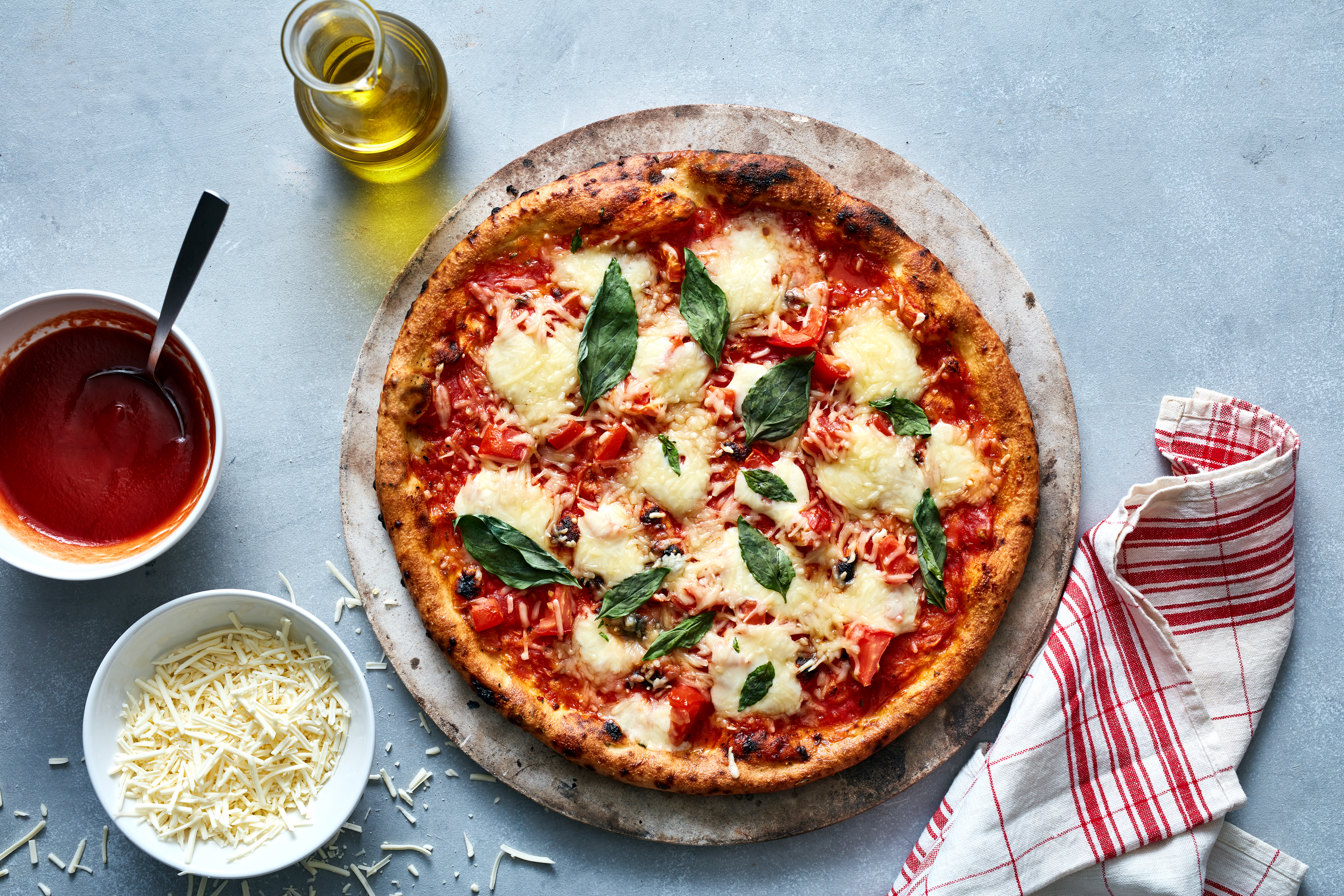 Divisez la pâte en pâtons et laissez-les doubler de volume à température ambiante avant utilisation (comptez jusqu’à 3 heures). Farinez le plan de travail et étirez la pâte uniquement à la main pour former des fonds de pizza de taille moyenne (ne pas utiliser de rouleau).